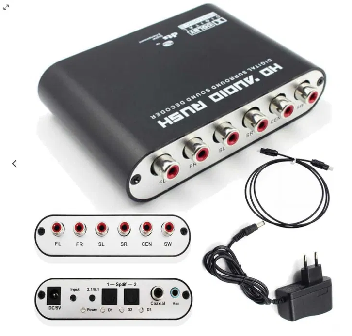 🔄 Konwersja cyfrowo-analogowa: Zamienia sygnał cyfrowy SPDIF (optyczny lub coaxial) na analogowy 5.1 (6x RCA) lub stereo (2x RCA / jack 3,5 mm).